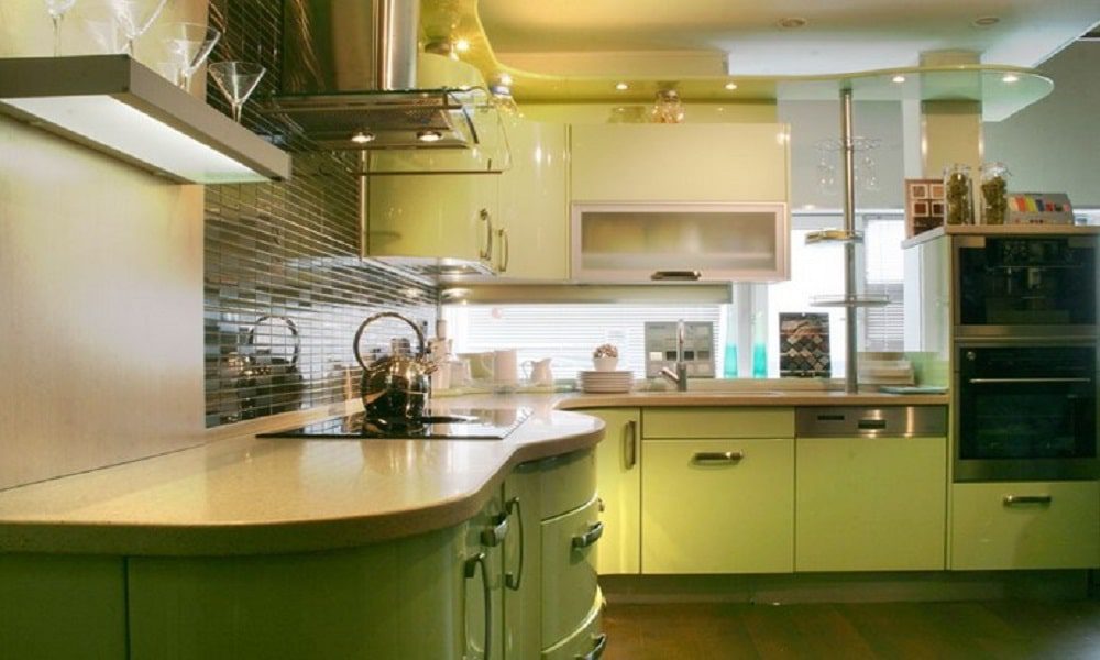 Однако для маленьких кухонь такой вариант не подойдёт: помещение будет казаться тёмным. А вот для просторных комнат жёлто-зелёная расцветка стен окажется в самый раз. В качестве отделочного материала можно использовать декоративную штукатурку, моющиеся обои, плитку или краску. Используя последний отделочный материал можно самостоятельно подобрать идеально подходящий оттенок.