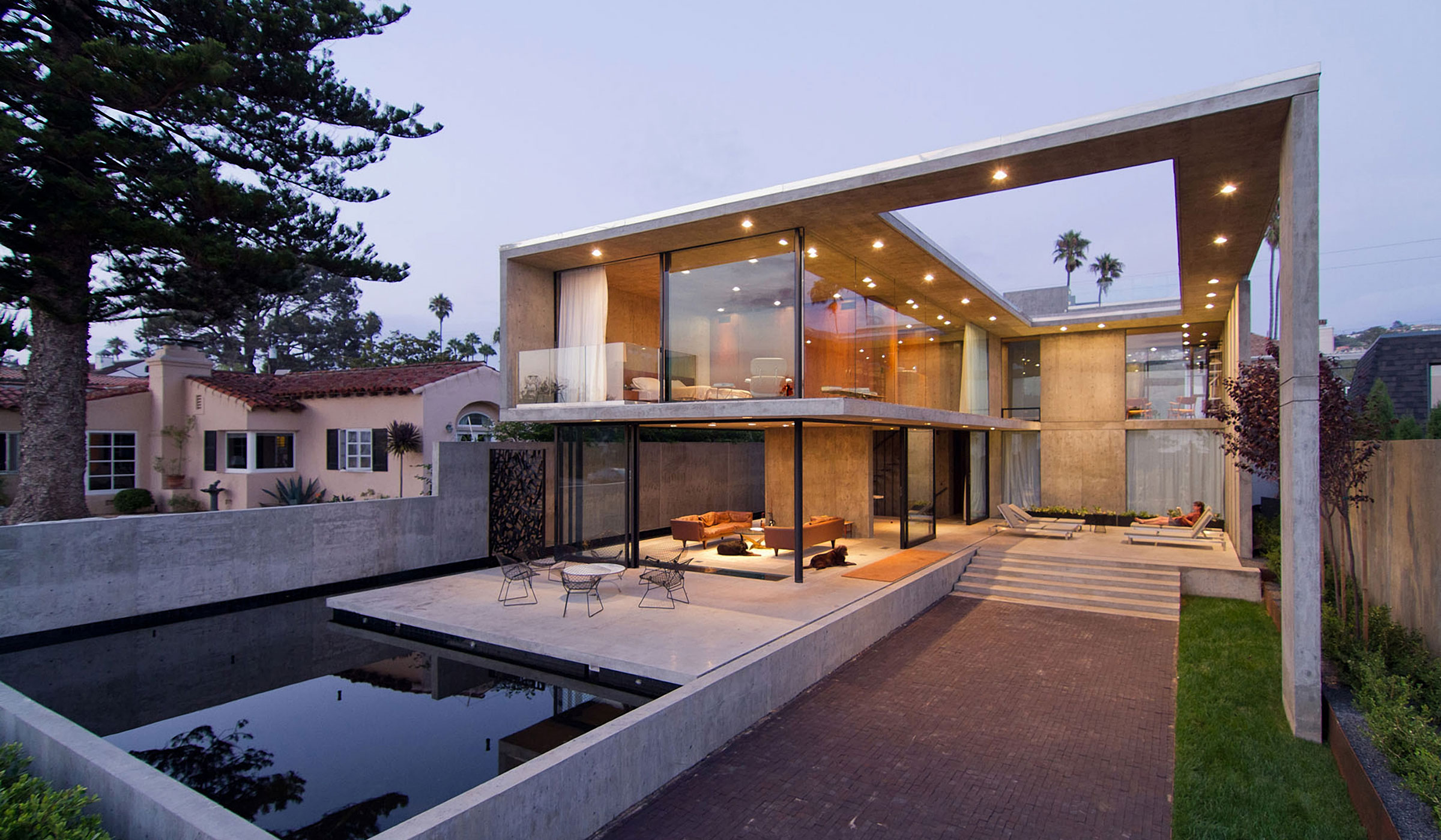 Сочетание этих материалов в строительстве выбирается по причине пластичности бетона, позволяющей создать здание любой формы, концепции, дизайна. Использование бетонных элементов вместо газоблоков и стекла, повышающего уровень естественного освещения, делает дом намного более энергосберегающим.