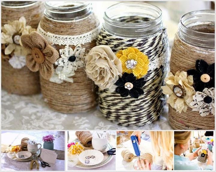 Бечевка подходит для создания различных узоров на поверхности банки, своеобразного чехла или рамки. Этот материал похож на лозу, и используется в тех же целях.